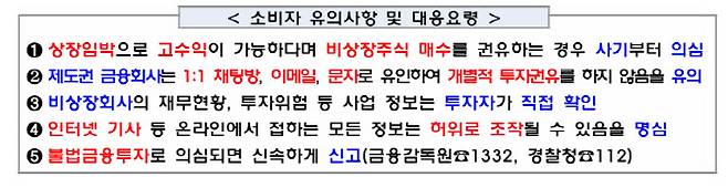금감원은 “상장이 임박했다며 비상장주식 매수를 권유하는 경우 무조건 사기를 의심해야 한다”고 당부했다.