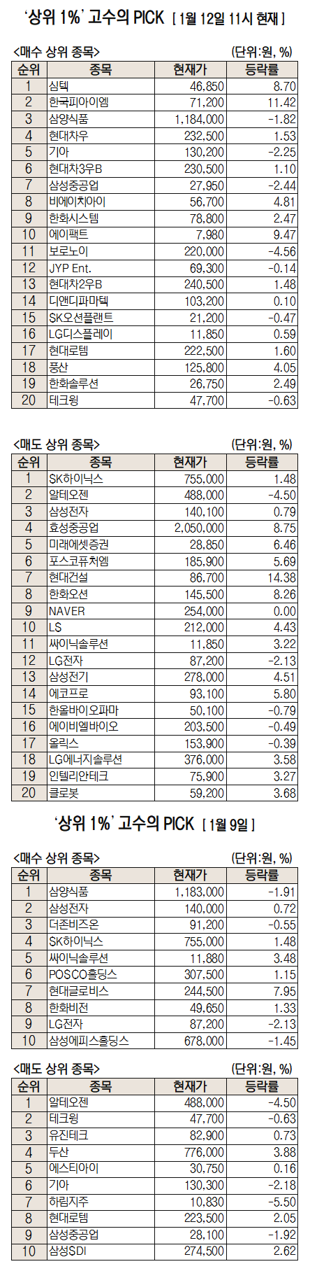 미래에셋증권에서 거래하는 고수익 투자자들이 12일 오전 가장 많이 순매수한 종목은 심텍(222800), 한국피아이엠(448900), 삼양식품(003230), 현대차우(005385) 등의 순으로 집계됐다.