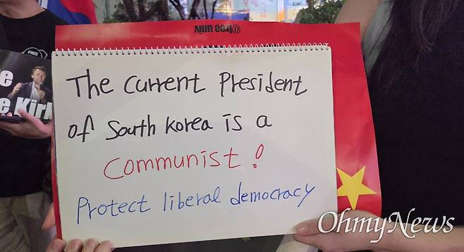| ▲ 극우 성향 청년단체 '자유대학'이 2025년 9월 16일 서울 중구 서울중앙우체국 인근에서 혐중 시위를 진행하고 있다. 한 참가자가 직접 만든 피켓("대한민국 현 대통령은 공산주의자다! 자유민주주의를 수호하라")을 들고 있다. |