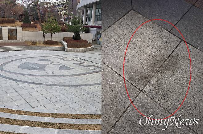 | ▲ 충북 청주시 충북대학교 개선문화회관 광장의 2025년 12월 11일 모습(왼쪽). 극우 유튜버들은 지난해 3월 11일 오후 7시께 이곳에서 열린 윤석열 탄핵 촉구 집회에 난입해 현수막을 불태웠다. 오른쪽 사진은 촬영 당시에도 남아 있던 방화 흔적. 2025. 12. 11. |