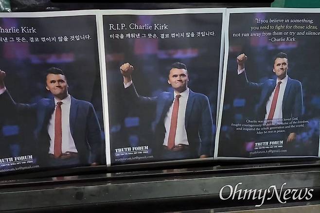 | ▲ 2025년 10월 2일 충북대 중앙도서관 앞에 부착된 찰리 커크 추모 포스터. 이 포스터는 서울대 극우 단체로 불리는 '트루스포럼'에서 제작했다. |
