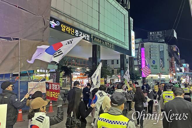 | ▲ 2025년 10월 28일 충북대 인근 성안길에서 열린 극우 단체의 집회 모습. |