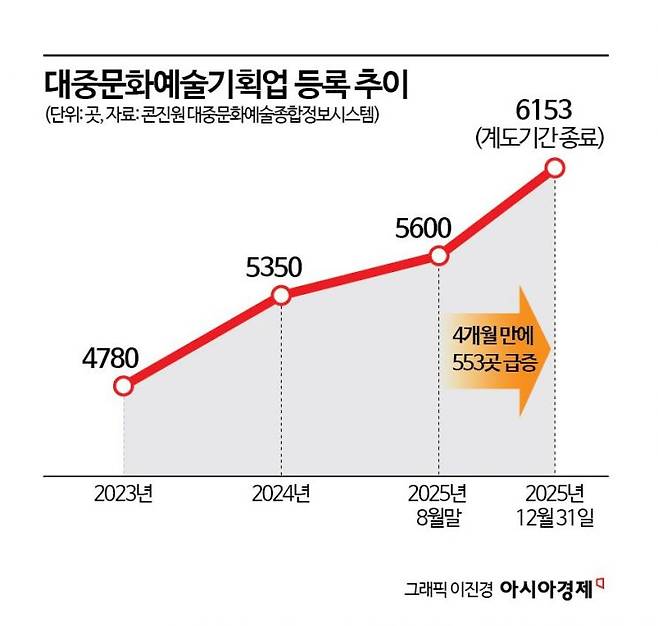 12일 문체부와 한국콘텐츠진흥원에 따르면 2025년 12월 31일 기준 정식 등록 업체는 총 6153곳이다. 지난해 9월 약 5600곳에서 넉 달 만에 500곳 넘게 늘었다. 특히 계도기간 종료가 임박했던 12월 한 달에만 177곳이 등록했다. 2024년 전체 증가분(약 570곳)의 70%가 서너 달 만에 몰린 결과다.