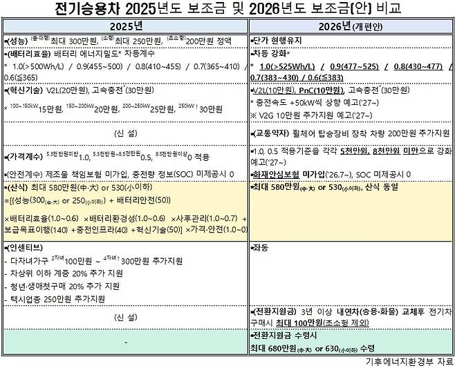 ▶이달 말 또는 다음달 초 구매 보조금 신청 가능 =기후에너지환경부는 이달 2일부터 9일까지 ‘2026년도 전기차 구매보조금 개편방안(이하 보조금 개편안)’에 대한 공개 의견수렴을 진행했다.
