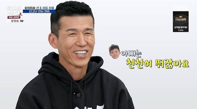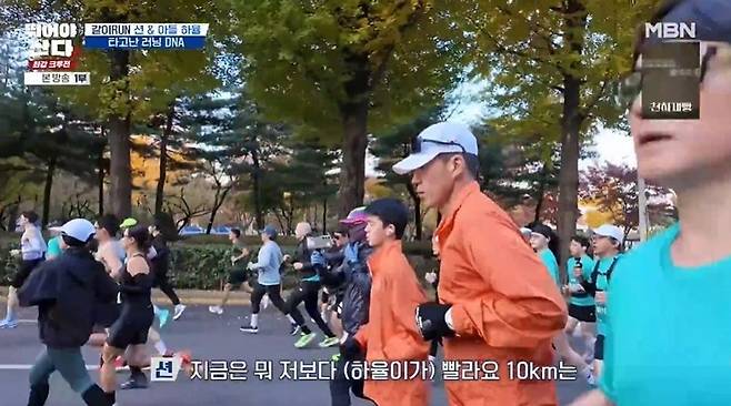 션은 셋째 아들 하율과 뛰게 됐다. 배성재는 "원래 부자 케미가 대화를 많이 안 하는 게 (케미)"라며 두 사람은 어떨지 궁금해했다. 션은 하율에게 "편하게 뛰어"라며 "하율이도 컨디션 좋으면 앞에 있을 텐데"라고 했고, 하율인 고개를 끄덕거렸다.