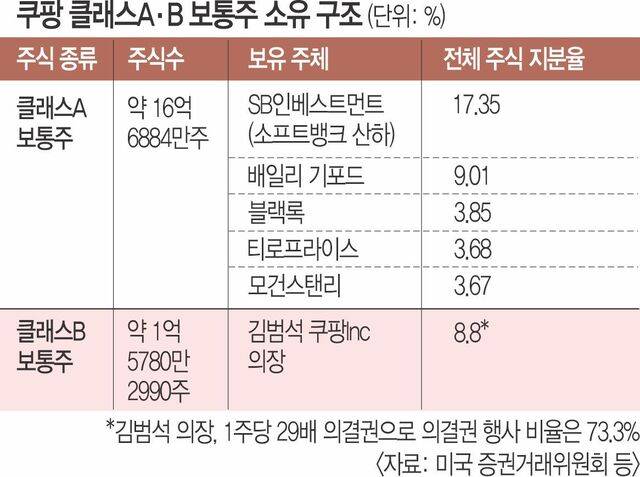 미 증권거래위원회(SEC)에 따르면 지난해 9월 말 기준 쿠팡Inc의 전체 발행 주식 수는 18억2664만7538주다. 쿠팡은 클래스A·B 두 종류의 보통주만 발행했는데 이 가운데 클래스A는 16억6884만4548주, 클래스B는 1억5780만2990주다. 클래스A 주식은 소프트뱅크 산하 SB인베스트먼트가 17.35%로 최대주주인 반면, 클래스B 주식은 발행 물량 전량을 김범석 의장이 보유하고 있다. 주식 수 기준 김 의장의 지분율은 8.7%에 불과하지만, 클래스B에 부여된 29배 차등의결권으로 의결권 비중은 73.3%에 달한다. 소수 지분만으로도 경영 전반을 사실상 좌우할 수 있는 구조인 것이다.