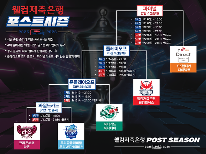 이어 14일 오후 9시 30분에는 와일드카드 승팀이 하나카드와 만나는 준플레이오프(3전 2선승제)가 열린다. 여기서 승리하면 플레이오프(5전 3선승제)에서 웰컴저축은행과 16일 오후 9시 30분부터 격돌한다.