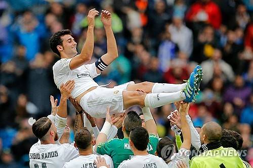 FILE - Real Madrid's Alvaro Arbeloa is thrown into the air by his team mates after playing his last match for the the team during a Spanish La Liga soccer match between Real Madrid and Valencia in Madrid, Spain, on May 8, 2016. (AP Photo/Paul White, File) FILE PHOTO