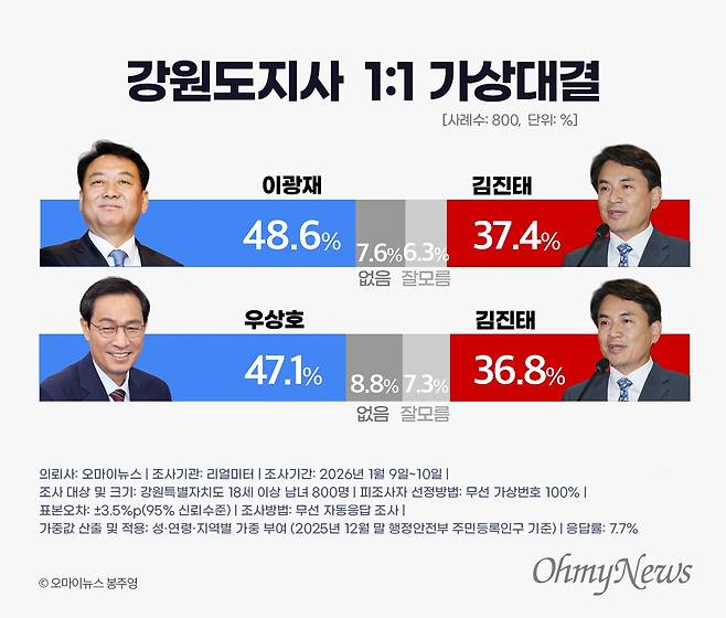 특히 민주당 후보군인 이광재 전 지사와 우상호 수석은 모두 국민의힘 후보 지지도 1위 김진태 지사와의 가상대결에서 10%p 이상 앞서며 오차범위 밖 우세를 기록했다.