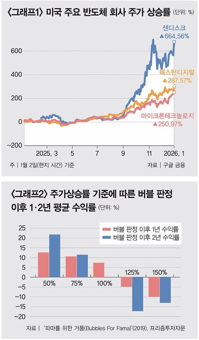 실제로 미국 주요 반도체 회사인 샌디스크와 웨스턴디지털, 마이크론테크놀로지는 네드 데이비드 리서치의 주장대로 지난해 최고 상승률을 기록하며 '버블의 3가지 조건'을 충족했다(그래프1 참조). 하지만 논문을 더 자세히 읽어보니 이 모형의 적중률이 너무 낮았다. 2년간 주가상승률 100% 기준을 적용하면 총 40번 '버블' 판정을 내릴 수 있는데, 실제로 주식시장이 붕괴된 사례는 21건에 불과했다. 즉 50% 확률에 불과하다는 것이다. 물론 1999년 정보기술(IT) 거품 때는 이런 현상이 주가 폭락으로 연결된 사례가 많았지만, 그 외 기간에는 적중률이 높지 않았다. 차라리 그것보다는 주가 미래를 예측하는 데 주가상승률 100%보다 125%나 150% 기준이 더 적합하다는 판단이 들었다(그래프2 참조). 따라서 네드 데이비스 리서치의 주장은 신뢰성이 크게 떨어진다고 판단된다.그 대신 논문의 다른 부분들이 더 설득력을 지니고 있었다. 특히 가속도와 주식 발행, 신생 기업 비율 같은 지표가 미래 주가 방향을 설명하는 데 더 도움이 된다는 내용이 그렇다. 첫 번째 지표는 가속도(acceleration)다. 주가가 지난 2년간 200% 상승하고, 최근 6개월간 100% 올랐다면 가속도가 엄청나게 붙은 것으로 볼 수 있다. 이처럼 주가가 완만하게 상승한 것이 아니라 갑자기 산업 전체 수익률이 폭등했다면 이후 폭락 가능성이 크다는 의미다. 이런 점에서 볼 때 '그래프1'은 그렇게 매력적인 모습은 아니다. 무섭게 가속도가 붙은 로켓처럼 올랐으니 말이다.