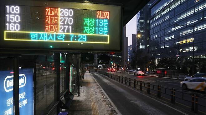 오전 7시 30분 강남역사거리 전광판에도 시내버스들은 차고지에 있다고 안내됐습니다.
