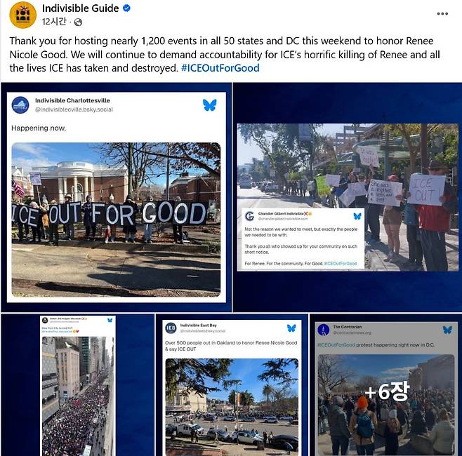 이민세관단속국(ICE) 요원에 의한 르네 니콜 굿(Renee Nicole Good, 37) 피살 사건에 항의하는 시위가 미 전역 1200여 개 도시에서 동시다발적으로 열린 가운데, 주최 측 추산 약 110만 명의 시민이 거리로 쏟아져 나온 것으로 확인됐다.