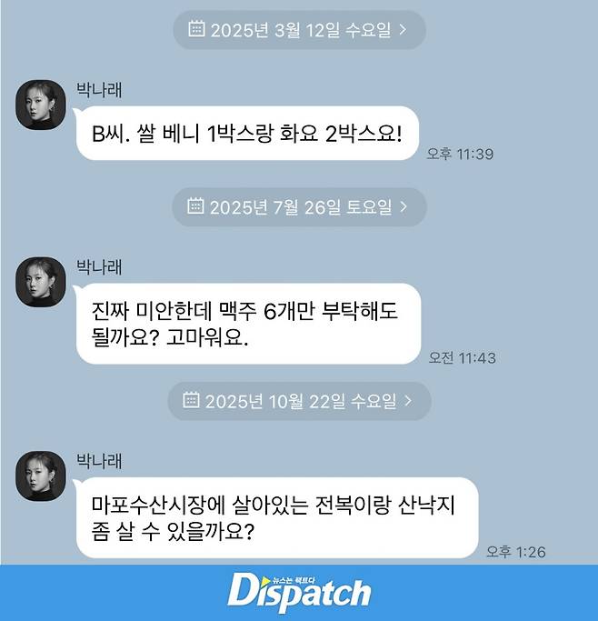 "일부 유튜버는 '박나래가 얼마나 잘해줬는데 어떻게 그럴 수 있냐'고 하더군요. 그럼 우리가 못해준 건 뭐죠? 혹시 이런 심부름도 해보셨어요? 저희는 정말 최선을 다했습니다." (B씨)