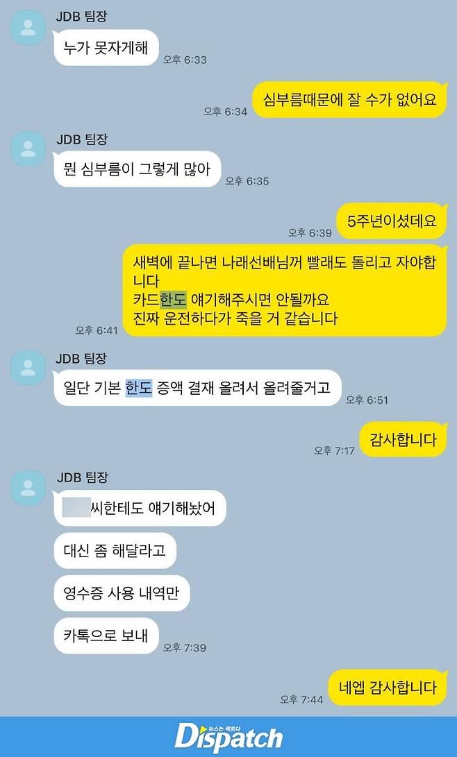 44. '디스패치'는 매니저 A씨의 1년치 법카 내역을 확인했다.