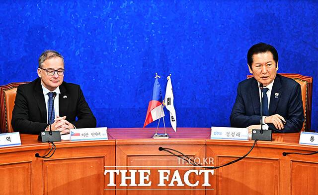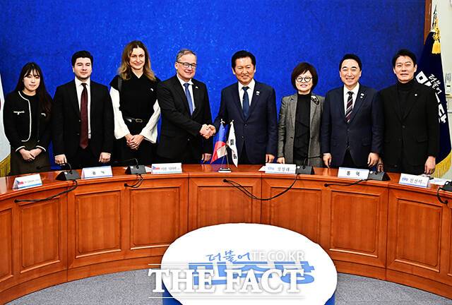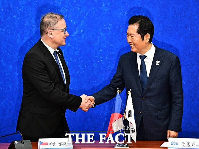 [더팩트ㅣ국회=배정한 기자] 정청래 더불어민주당 대표가 13일 오전 서울 여의도 국회에서 이반 얀차렉 주한체코대사(왼쪽)를 접견하며 기념사진 촬영을 하고 있다.