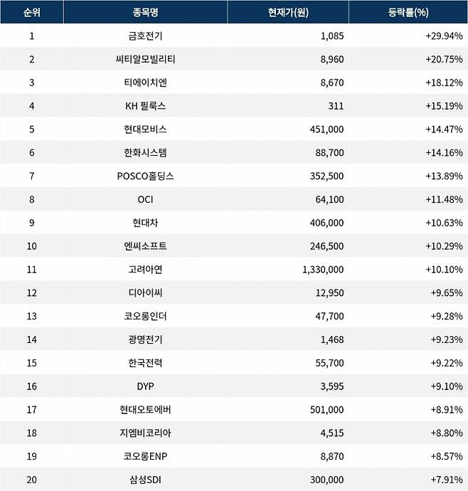 6위 한화시스템(272210)은 종가 88,700원으로 14.16% 상승 마감했다. 7위 POSCO홀딩스(005490)는 종가 352,500원으로 13.89% 상승 마감했다. 8위 OCI(456040)는 종가 64,100원으로 11.48% 상승 마감했다. 9위 현대차(005380)는 종가 406,000원으로 10.63% 상승 마감했다. 10위 엔씨소프트(036570)는 종가 246,500원으로 10.29% 상승 마감했다.