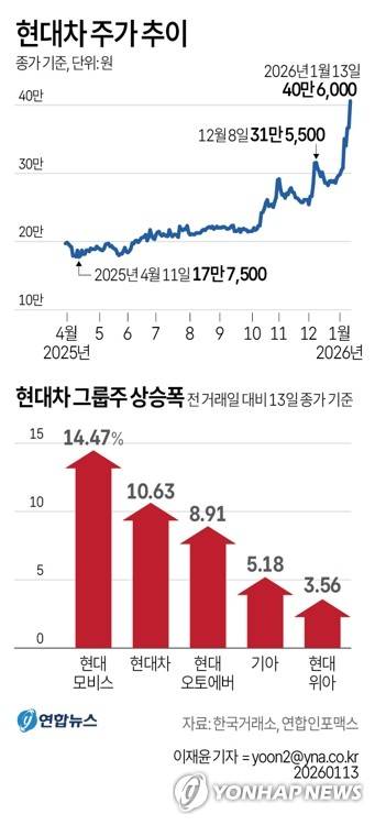 이날 유가증권시장에서 현대차는 전장보다 10.63% 오른 40만6천원에 거래를 마치며 3거래일 연속 상승했다.