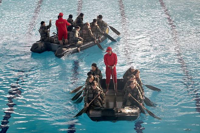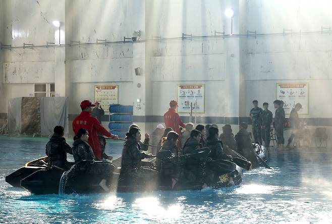 13일 오전 포항 해병대 1사단에서 열린 '2026년 겨울 해병대 캠프' 참가자들이 인천상륙관에서 IBS(소형고무보트) 체험을 하고 있다.