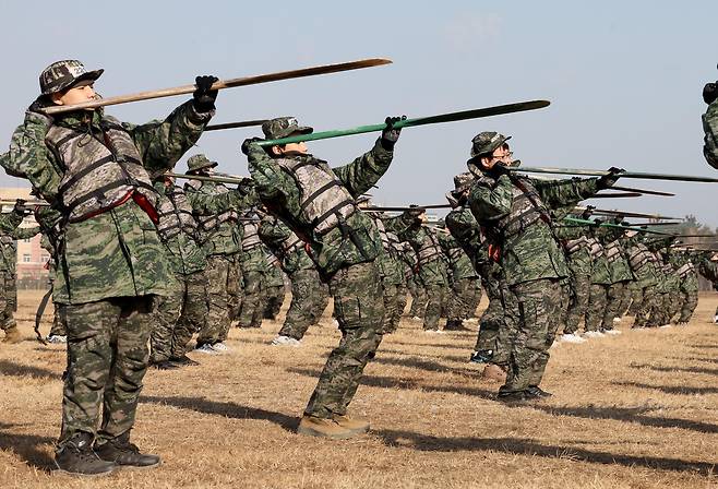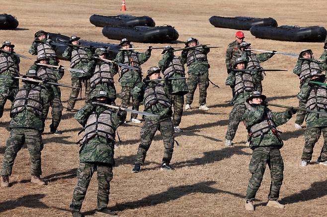 13일 오전 포항 해병대 1사단 연병장에서 열린 ‘2026 겨울 해병대 캠프’에서 참가자들이 IBS(소형 고무보트) 육상페달링 연습을 하고 있다. /이용선기자 photokid@kbmaeil.com