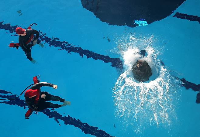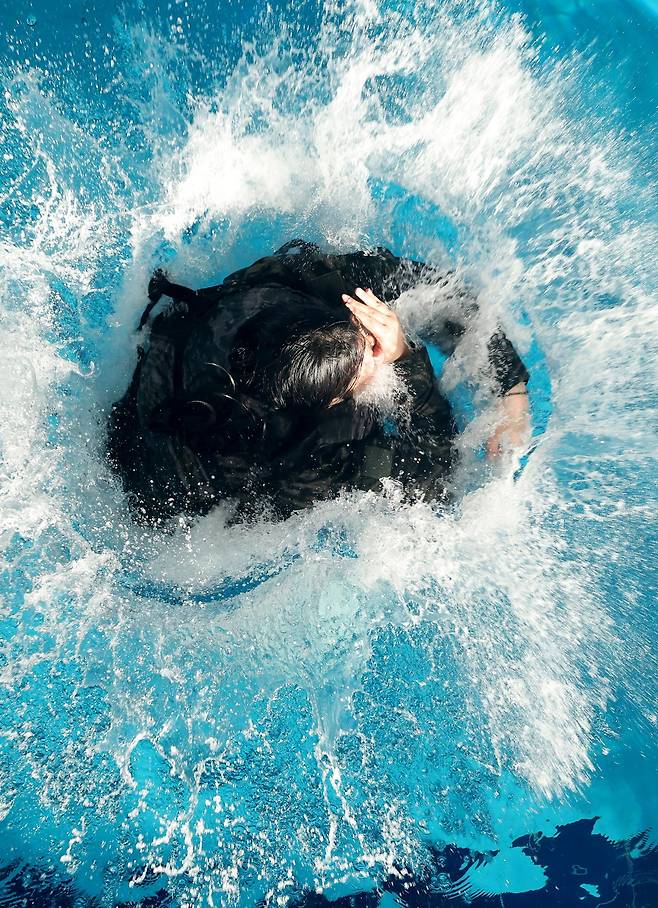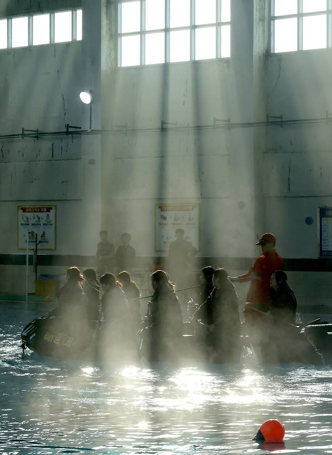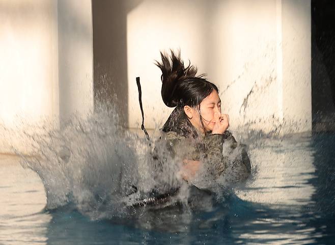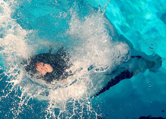 13일 오전 포항 해병대 1사단에서 열린 '2026년 겨울 해병대 캠프' 참가자들이 인천상륙관 다이빙대에서 비상시 함정을 탈출하는 이함훈련을 하고 있다.