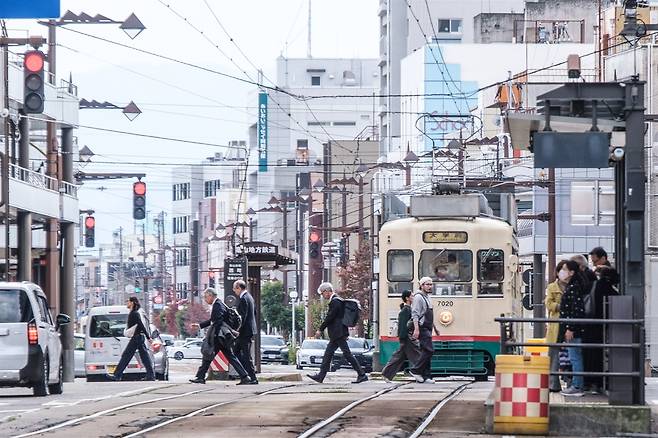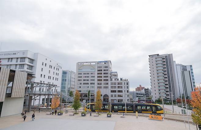 | ▲ 일본 도야마시 도심에 경전철이 지나가는 모습. 도야마시는 대중교통 중심의 콤팩트 시티 전략을 추진하고 있으며, 도심과 주요 생활권을 연결하는 경전철을 핵심 교통수단으로 활용하고 있다. |