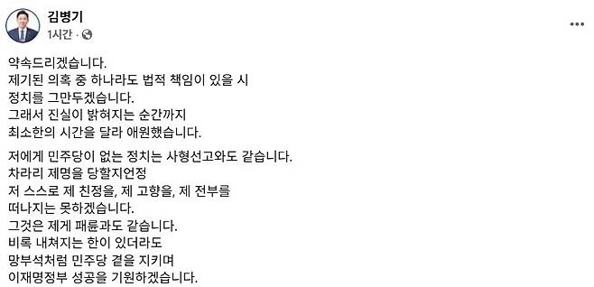 김병기 "의혹 중 하나라도 법적 책임 있을 시 정치 그만두겠다"