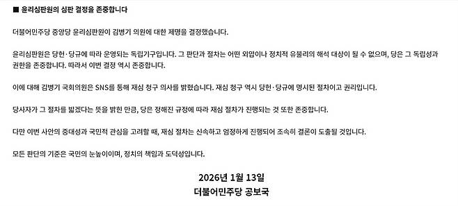 13일 박수현 수석대변인은 서면브리핑에서 윤리심판원의 김 의원 제명 결정에 대해 "윤리심판원은 당헌·당규에 따라 운영되는 독립기구다. 그 판단과 절차는 어떤 외압이나 정치적 유불리의 해석 대상이 될 수 없으며, 당은 그 독립성과 권한을 존중한다. 따라서 이번 결정 역시 존중한다"고 밝혔다.