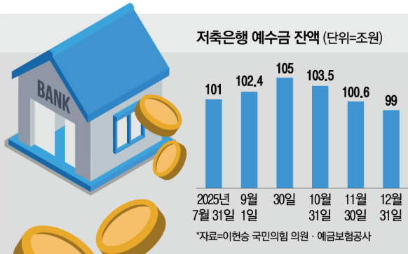 13일 이헌승 국민의힘 의원실이 예금보험공사로부터 받은 ‘저축은행 예수금 잔액 현황’에 따르면 지난해 12월 말 기준 저축은행 예수금은 약 99조원으로 집계됐다. 지난해 9월 1일부터 예금자보호한도가 1억원으로 높아져 저축은행으로 예수금이 유입될 것으로 기대됐지만 실제로는 감소세를 보인 것이다.