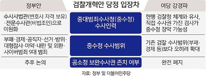 다만 여권 일각에선 형사사법체계 개편에 따른 혼란을 최소화하기 위한 마지노선으로 정부안을 바라봐야 한다는 시각이 있다. 한 민주당 인사는 “보완수사 요구는 경찰이 수용하지 않아 실익이 없다. 보완수사권을 공소청에 부여하는 것이 현실적”이라고 했다. 그는 “지금도 검찰 수사의 대부분은 일반 형사사건”이라며 “경찰 수사로 밝히지 못한 사안들이 검찰에서 밝혀지고 있다. 강성파들 말대로면 피해자는 국민이다. 돈 있고 백 있는 사람들은 더 좋아질 것”이라고 했다.