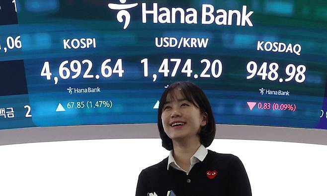 | 코스피는 연일 최고치 코스피가 전날 대비 1.47% 상승한 4692.64로 장을 마감해 또다시 사상 최고치를 경신한 13일 오후 서울 중구 하나은행 딜링룸 현황판에 코스피 지수와 원·달러 환율이 표시돼 있다. 코스피는 새해 들어 8거래일 연속 상승기록을 이어갔고 정부가 천명한 ‘오천피’(코스피 5000)를 불과 6.55% 남겨뒀다. 원·달러 환율은 서울외환시장에서 전장 대비 5.30원 오른 1473.70원에 주간 거래를 마쳤다. 연합뉴스 |