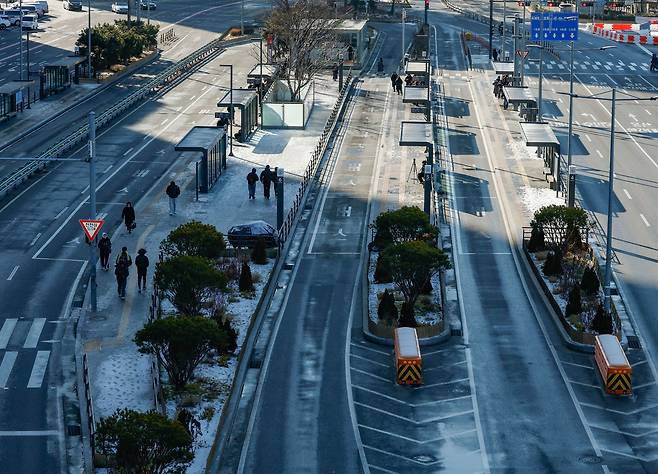 이날 강남구 대치동 버스정류장 안내판에는 모든 버스의 ‘도착 예정 시간’ 부분에 ‘차고지’라고만 표시돼 있었다. 대형 관광버스가 ‘긴급수송버스’ 팻말을 붙이고 간간이 오갈 뿐이었다.