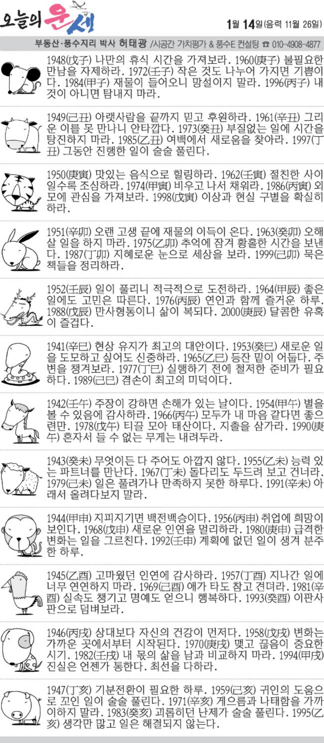 1월 14일 오늘의 운세(음력 11월 26일) 허태광 부동산·풍수지리 박사 2026. 1. 13. 19:55 음성으로 듣기 음성재생 설정 이동 통신망에서 음성 재생 시 데이터 요금이 발생할 수 있습니다. 글자 수 10,000자 초과 시 일부만 음성으로 제공합니다. 남성 여성 느림 보통 빠름 음성 재생하기 닫기 음성 재생 중지 번역 설정 번역beta Translated by kaka i 한국어 - English 영어 日本語 일본어 简体中文 중국어 Nederlands 네델란드어 Deutsch 독일어 Русский 러시아어 Malaysia 말레이시아어 বাঙ্গোল ভাষা 벵골어 tiếng Việt 베트남어 Español 스페인어 اللغة العربية 아랍어 Italiano 이탈리아어 bahasa Indonesia 인도네시아어 ภาษาไทย 태국어 Türkçe 튀르키에어 Português 포르투갈어 Français 프랑스어 हिन्दी 힌디어 닫기 번역중 Now in translation 글씨크기 조절하기 글자크기 설정 파란원을 좌우로 움직이시면 글자크기가 변경 됩니다. 가 매우 작은 폰트 작은 폰트 보통 폰트 큰 폰트 매우 큰 폰트 가 이 글자크기로 변경됩니다. (예시) 가장 빠른 뉴스가 있고 다양한 정보, 쌍방향 소통이 숨쉬는 다음뉴스를 만나보세요. 다음뉴스는 국내외 주요이슈와 실시간 속보, 문화생활 및 다양한 분야의 뉴스를 입체적으로 전달하고 있습니다. 닫기 인쇄하기