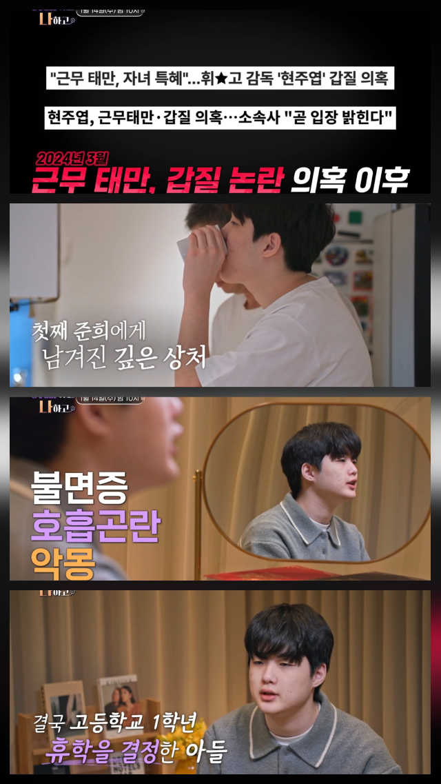 현주엽은 근무 태만·갑질 의혹 논란 이후 약 40kg이 빠질 정도로 극심한 마음고생을 겪었다고 털어놨다. 그는 “억울하고 화도 났지만, 그건 혼자 견디면 되는 문제였다”며 “아이들과 아내까지 힘들어하는 모습을 보는 게 가장 괴로웠다”고 말했다. 그중에서도 가장 큰 변화를 겪은 건 첫째 아들 준희였다.