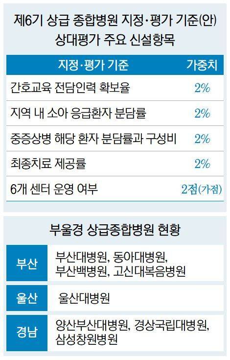 부울경 상급종합병원 상당수는 6개 센터 신설에 어려움을 겪고 있다. 부산의 경우 상급종합병원 모두 구도심에 위치하고 있어 부지 여유가 별로 없는 상황이다. 이들 대부분은 용적률 90% 상당을 이미 쓰고 있으며, 일부 병원은 150% 이상에 달하는 것으로 알려졌다. 부산 지역 상급종합병원의 경우 가점을 받을 수 있는 센터가 하나도 없는 곳도 존재한다. 부지 부족으로 수년간 추진했던 권역응급의료센터 지정을 받지 못한 곳도 있다.