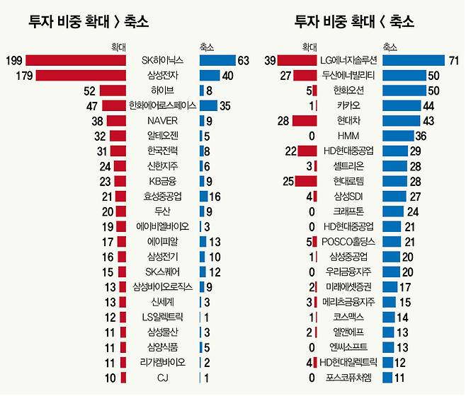 당분간 반도체 투톱 독주가 이어진다는 전망에 무게가 쏠린다. 올 상반기 SK하이닉스 편입 비중을 확대하겠다는 펀드매니저가 199명으로 가장 많다. 그 뒤를 삼성전자(179명)가 잇는다. 3위 하이브(52명)와 압도적인 차이다. 그만큼 많은 기관이 올해 두 종목을 사들일 전망이다.