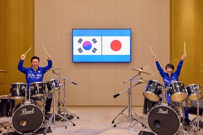 이재명 대통령과 다카이치 사나에 일본 총리가 13일 일본 나라현 환담자리에서 일본 측이 마련한 푸른색 유니폼을 함께 착용하고 드럼 앞에서 즉석 드럼 합주를하고 있다.