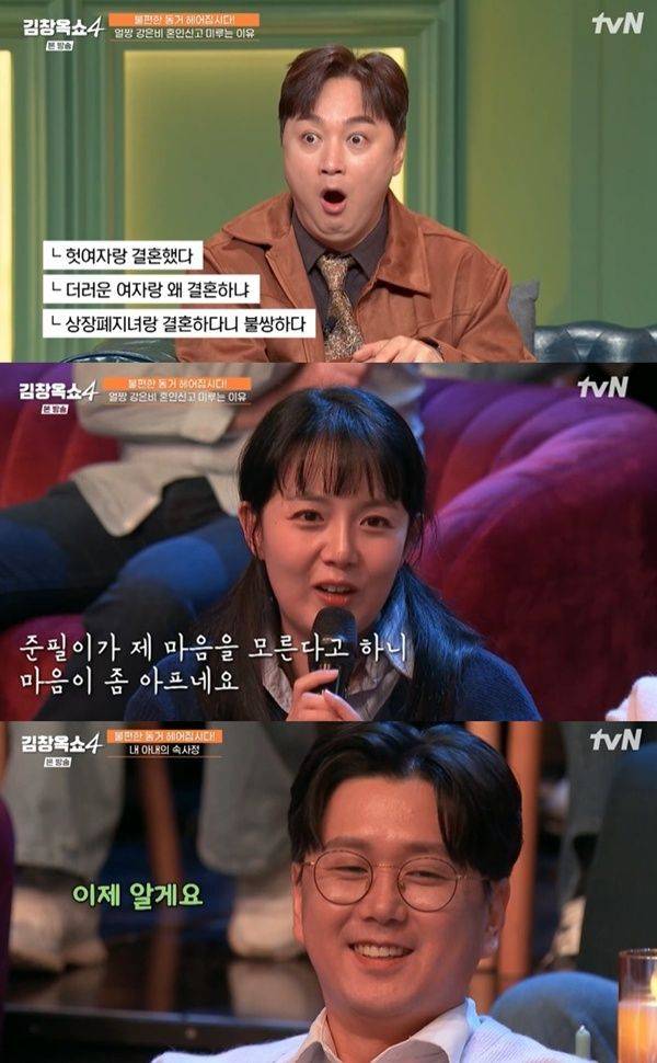 13일 방송된 tvN 예능 프로그램 '김창옥쇼4'에서는 결혼 1년차 강은비, 변준필 부부가 출연했다.