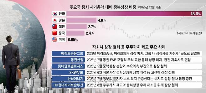 국내 중복상장 비중은 주요국과 비교해 압도적으로 높다. 13일 NH투자증권에 따르면 지난해 12월 기준 국내 증시 시가총액 중 중복상장 기업이 차지하는 비율은 18.0%에 달한다. 일본(4.0%), 미국(0.05%)은 물론 대만(2.7%), 중국(2.4%)보다도 월등히 높다.