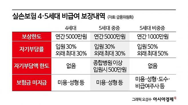 5세대 실손은 4세대와 비교해 보험료가 30~50% 낮아진다. 대신 비급여 항목을 중증과 비중증으로 구분해 중증은 최대한 기존과 동일하게 보장하되 비중증은 자기부담률을 높이고 보장 범위를 줄였다. 암·뇌혈관·심장질환 같은 중증 비급여는 4세대와 보장이 유사하지만 대학병원이나 종합병원 입원 시 연간 자기부담 한도가 500만원으로 제한돼 4세대보다 혜택이 더 좋다. 비중증 비급여의 경우 자기부담률이 현행 30%에서 50%로 올라가고 연간 보상한도는 기존 5000만원에서 1000만원으로 낮아지는 등 혜택이 축소된다. 통원치료는 하루 20만원 한도가 적용되고 도수치료 등 과잉진료를 야기하는 일부 항목은 보장에서 제외된다.