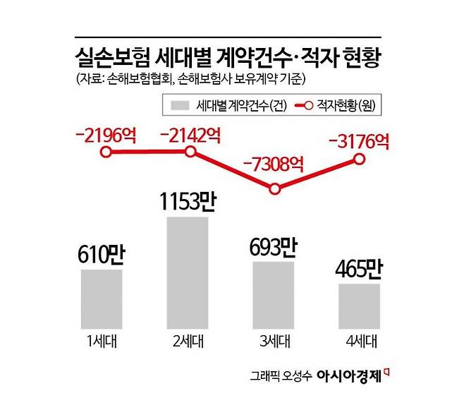 '제2의 건강보험'으로 불리는 실손보험은 그동안 의료쇼핑과 과잉진료 탓에 매년 1조원이 넘는 적자가 쌓이고 있다. 손해보험협회가 지난해 말 신설한 실손보험 관련 공시를 보면 2024년 기준 국내 손보사 13곳의 실손보험은 1조4822억원의 적자를 기록했다. 3세대가 7308억원 적자로 규모가 가장 컸고 뒤이어 4세대(-3176억원)·1세대(-2196억원)·2세대(-2142억원) 순이었다.