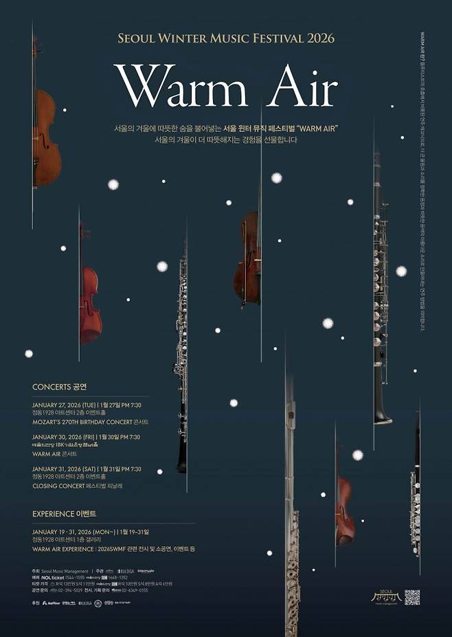 주요 공연으로는 오는 27일 정동1928 아트센터에서 열리는 개막 연주회 '모차르트 탄생 270주년 기념 콘서트', 30일 예술의전당 IBK챔버홀에서 진행되는 'Warm Air' 콘서트, 31일 폐막 연주회 겸 콩쿠르 파이널 무대가 마련된다. 세계적인 플루티스트 패트릭 갈루아를 비롯해 헨릭 비제, 필립 베로, 비토르 페르난데스, 필립 윤트, 채재일, 박지은 등 국제 무대에서 활약 중인 연주자들과 국내 정상급 음악가들이 대거 참여한다. 플루트, 클라리넷, 오보에 등 목관악기를 중심으로 한 공연으로 겨울의 정서와 어우러진 깊이 있는 클래식 음악의 매력을 선보일 예정이다.