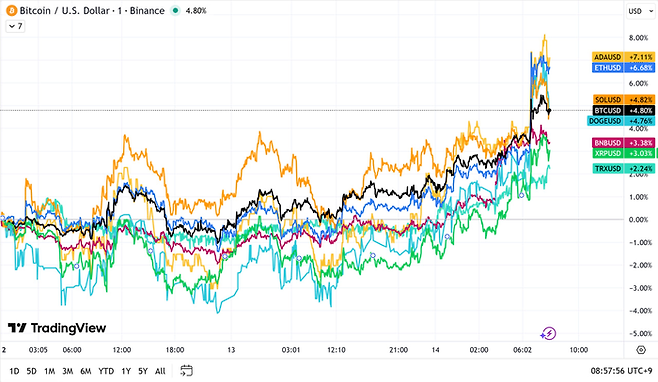 솔라나와 도지코인도 4.82%, 4.76% 상승했다.