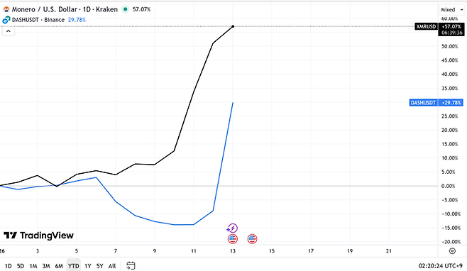 같은 기간 대시(DASH) 또한 30.08% 급등했다. 이 코인 또한 결제과정에서 개인정보를 숨길 수 있는 코인이다.