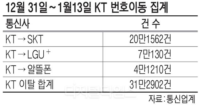 14일 통신업계에 따르면 KT가 지난해 12월 31일부터 올해 1월 13일까지 위약금 면제 정책을 시행한 기간 KT에서 이탈한 가입자는 총 31만2902명으로 집계됐다.