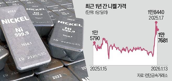 니켈 가격은 러시아의 우크라이나 침공 직후인 2022년 4월 월평균 t당 3만3300달러에서 거래됐다. 하지만 전기차 수요가 점차 줄어들고 인도네시아의 니켈 공급량이 늘어나면서 가격이 떨어졌다. 2024년 10월 중순 마지막으로 t당 1만7000달러대를 기록한 뒤 지난해 말까지 줄곧 1만4000~1만6000달러에서 움직였다.