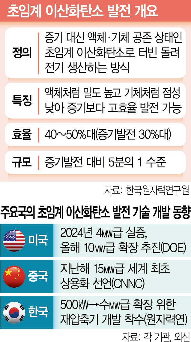 미국은 새해 10㎿급 발전소 실증을 추진한다. 에너지부(DOE)는 2017년 GTI에너지 컨소시엄에 1억 1900만 달러(약 1750억 원)를 지원하는 ‘초임계변환전력(STEP)’ 프로젝트에 착수해 2024년 4㎿ 시범 발전에 성공했다. 올해까지 10㎿, 효율 50% 이상을 달성하는 게 프로젝트의 목표다. 학계에서도 매사추세츠공대(MIT) 연구진이 2003년 초임계 이산화탄소 발전 가능성을 제시한 이래 아르곤국립연구소 등이 꾸준히 기술력을 축적해왔다.