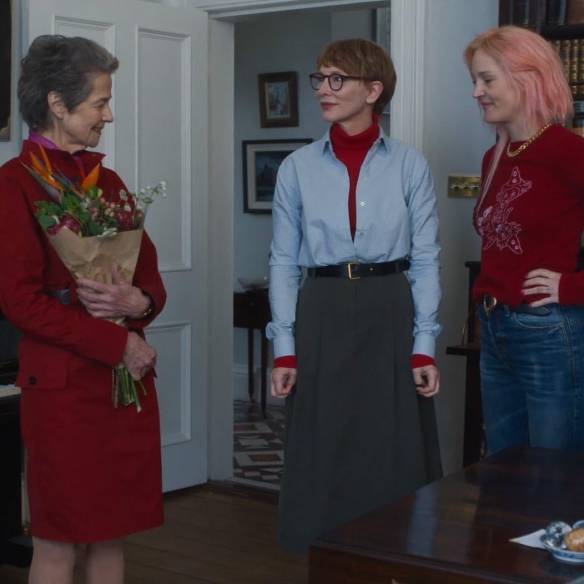 그런가 하면 때때로 모녀의 시간은 동시에 흐르기도 한다. 생 로랑 프로덕션이 선보인 짐 자무쉬 의 신작 〈파더 마더 시스터 브라더〉에서는 빨간색 하나가 운명의 붉은 실처럼 세 모녀를 단단히 엮는다. 극 중 엄마 역을 맡은 샬럿 램플링 과 두 딸을 연기한 케이트 블란쳇 , 비키 크립스 는 오랜만에 한 집에 모인다. 외투를 벗어든 두 딸을 물끄러미 바라보던 엄마는 이내 미소를 띠며 말한다. “그러고 보니 우리 모두 같은 색으로 맞춰 입었네.” 올곧고 단정한 케이트 블란쳇은 셋 중 가장 맑은 빨간색을, 어디로 튈지 모르는 말괄량이 비키 크립스는 짙은 빨간색 티셔츠를, 샬럿 램플링은 생 로랑의 우아한 버건디 코트 드레스를 걸친 채 웃음을 터뜨린다.