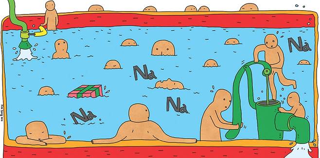 하지만 나트륨이 아무리 세포 작동에 필수적인 요소라 하더라도, 무한정 받아들일 수는 없다. 논은 개방된 구조라 유입되는 물이 많으면 그저 넘칠 뿐이지만, 세포는 닫힌 구조이기 때문에 나트륨이 많이 흘러 들어오면 삼투압이 증가해 세포가 뻥 터져버릴 수도 있다. 그래서 세포들은 나트륨이 세포 내로 흘러 들어오면 동시에 이를 부지런히 퍼내기 시작한다. 나트륨 채널이 인체 세포라는 논에 물을 대는 수문이라면, 나트륨 펌프는 말 그대로 옛날 우물에서 물을 길어 올리는 데 사용했던 일명 ‘작두 펌프’와 비슷하다. 작두 펌프는 힘을 들여 손잡이를 누를 때만 작동하며, 그것도 한 번 누를 때마다 딱 한 바가지만큼의 물만 올라온다.