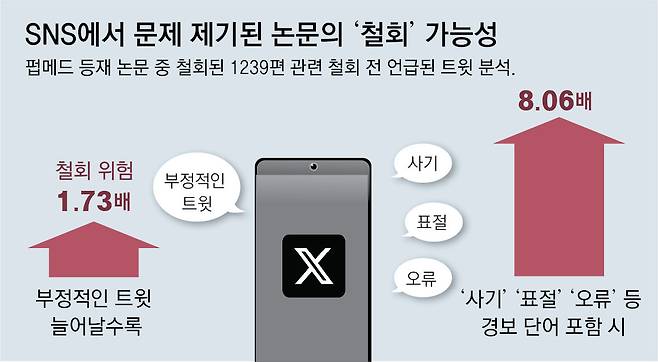 연구진은 2019∼2022년 의학 분야 학술 논문 공개 사이트 ‘펍메드’에 등재된 논문 중 철회된 1239편에 대해 철회되기 전 언급된 1만6562건의 트윗을 분석했다. 그 결과 트윗 안에 ‘사기’ ‘표절’ ‘오류’ 등과 같은 이른바 ‘레드 플래그(red flag·주의 신호)’ 단어가 포함될 경우, 논문 철회 위험률이 급격히 높아졌다.