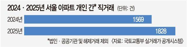 이런 상승세 속에서 지난해 공인중개사 없이 개인 간 직거래된 아파트도 증가했다. 이날 국토교통부 실거래가 공개시스템에 따르면 지난해 직거래된 서울 아파트는 1828건(법인·공공기관 매수 및 해제거래 제외)으로 집계됐다. 2024년(1569건)보다 16.5% 증가한 수치다.